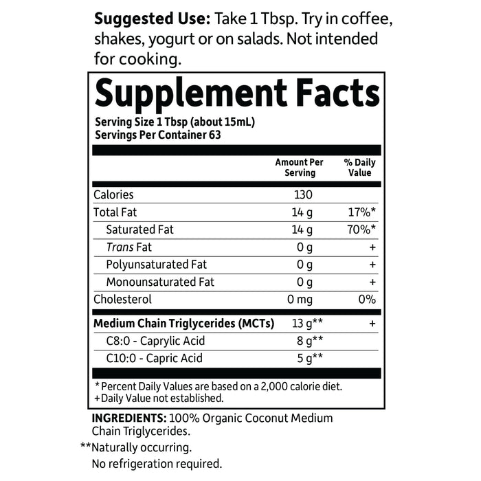• Garden of Life - Dr. Formulated Brain Health 100% Organic Coconut MCT Oil Unflavored - 32 fl. oz. (946 mL) Supplement Facts Serving Size: 1 Tbsp. (15ml) Servings Per Container: Approximately 63 Amount Per Serving % Daily Value Calories 130 Total Fat 14 g 17%* Saturated Fat 14 g 70%* Trans Fat 0 g + Polyunsaturated Fat 0 g + Monounsaturated Fat 0 g + Cholesterol 0 mg 0% Medium Chain