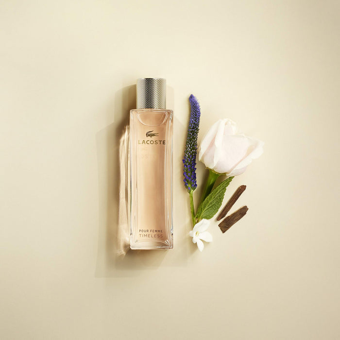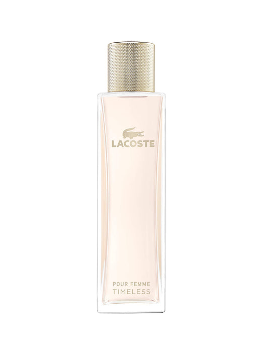 • Lacoste Pour Femme Timeless Eau de Parfum invites you to experience the emotion of a suspended moment.Lacoste Pour Femme Timeless Eau de Parfum brings the original fragrance to a new level of floral elegance. Floral, fruity, warmed with enveloping woods, Lacoste Pour Femme Timeless charms from the outset with a profusion of blushing roses, lifted by zesty mandarin. Gradually, the fragrance reveals its sensual, luminous heart: an opulent bouquet of orange blossom, jasmine and gardenia. Patchouli flirts with captivating incense in the dry down, creating a new sensuality enhanced by the richness of sandalwood - a key signature of the original Eau de Parfum, Lacoste Pour Femme.