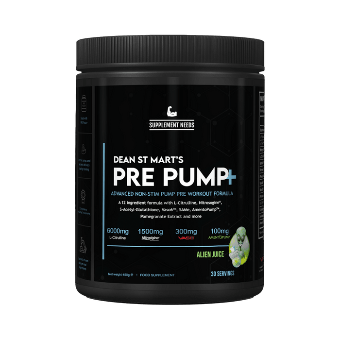 • Pre Pump+ 30 Servings Supplement Needs bring you their very own pump pre-workout formula developed by Dr. Dean St Mart as part of his trifecta series. The Pre Pump+ is here! Here are some words from the man himself\"As I’ve mentioned before, I didn't want to enter the Pre-workout market without bringing something different. An 11 ingredient supplement for skin splitting pumps with 3 trademarked quality ingredients and the addition of S-Acetyl-Glutathione, a superior oral delivery form of Glutathione compared to oral reduced Glutathione.\"
