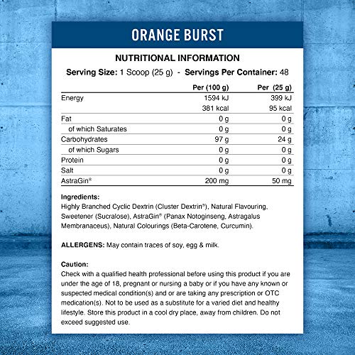 • Highly Branched Cyclic Dextrin (Cluster Dextrin®), Natural Flavouring, Sweetener (Sucralose), AstraGin® (Panax Notoginseng, Astragalus Membranaceus), Natural Colourings (Beta-Carotene, Curcumin).