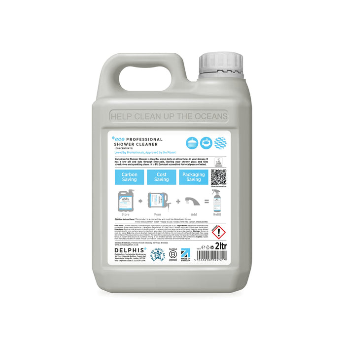 PROFESSIONAL QUALITY ECO DAILY SHOWER CLEANER for use on surfaces in your shower leaving it streak free and sparkling clean. This shower cleaner spray is great for hard water areas and makes light work of cleaning your shower. The low pH cuts through limescale on your shower, the shower glass and tiles. THIS PLANT BASED, vegan friendly, natural shower glass cleaner is ideal for use on shower screens, tiles, mirrors and glass, stainless steel and ceramics. Apply a small amount of the daily shower cleaner spray to a damp cloth and wipe the surface. For heavy cleaning, spray directly onto the surface, leave to stand for a few moments and wipe clean. This daily shower cleaner is made from highly biodegradable, renewable and sustainable ingredients, and is free from Chlorine bleaches, Hydrochloric Acid and is low in VOC’s. Plus it’s phosphate and phosphonate free for your total peace of mind. Delphis Eco products are packaged in bottles made from 100% recycled plastic and are fully recyclable. Loved by Professionals, Approved by the Planet 100% Made in Britain Vegan Friendly, Natural Plant Based Cleaning Product Ethical & Eco Friendly Sustainable Cleaning Highly Biodegradable