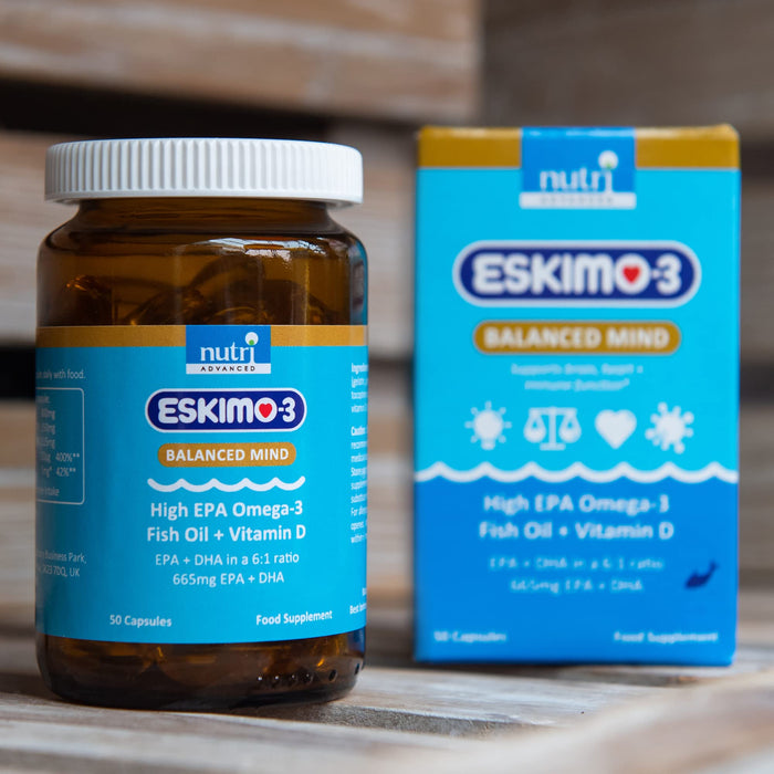 Our Eskimo Balanced Mind omega 3 capsules contain high EPA omega-3 fish oil that may help support a balanced mood and provide support for balancing inflammatory processes. It may be useful to support those who suffer from stress. The capsule format means it's ideal for those who don't like taking fish oil liquids and as well as targeted mental wellbeing and inflammation support it also has benefits for vision and heart health. Each capsule typically contains: Omega-3 Fatty Acids 800 mg Eicosapentaenoic acid 550 mg Docosahexaenoic acid 100 mg Vitamin E (7.5iu) 5 mg Vitamin D (cholecalciferol) (800iu) 20 μg Other ingredients: Gelatin Glycerol Mixed tocopherolsIngredientsFish oil (fish), capsule shell(gelatin, glycerol), vitamin E (d-alpha tocopherol), antioxidant: mixed tocopherols, vitamin D (cholecalciferol)Safety WarningNot recommended for haemophiliacs. Consult with a medical doctor if on anticoagulant medication. If taking any kind of medication or have a medical condition, consult a healthcare practitioner before using this productBox Contains1 x Revital Eskimo 3 Advanced EPA 50 Capsules
