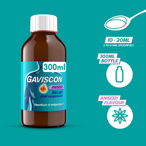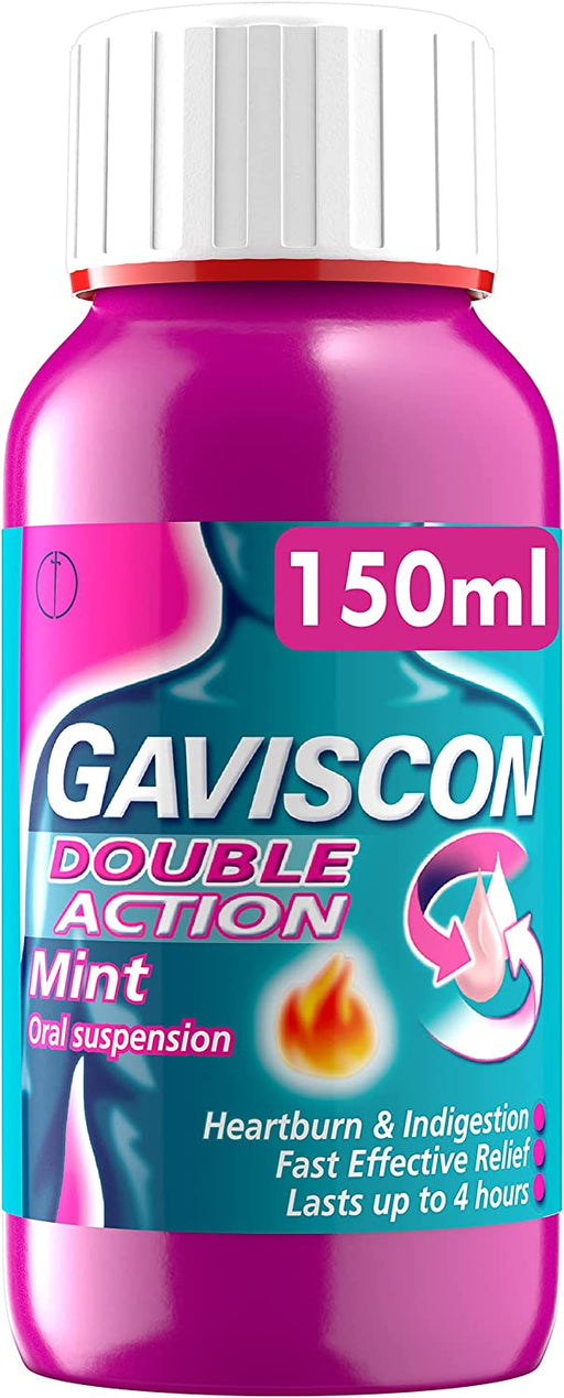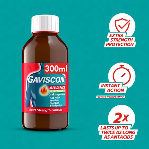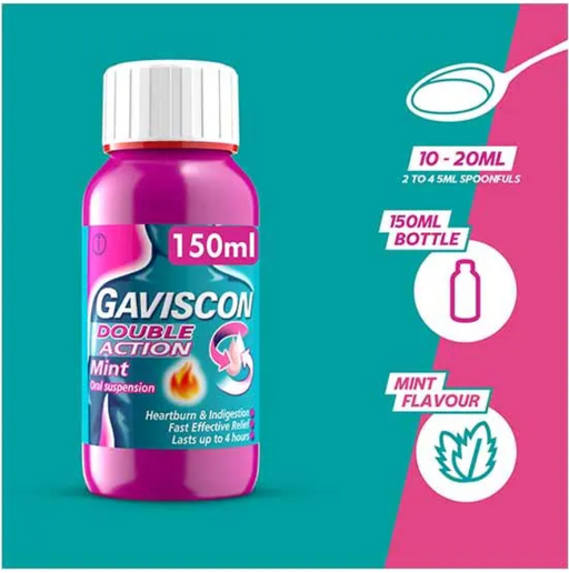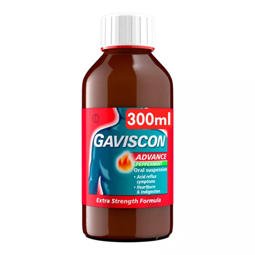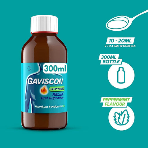 Gaviscon Peppermint Liquid has been specifically formulated for the treatment of gastro-oesophageal reflux. These symptoms include acid regurgitation, heartburn and indigestion which may occur following meals or during pregnancy, and in those who display symptoms of oesophagitis. This oral suspension belongs to a group of medicines called reflux suppressants which form a protective 'raft' on top of the stomach contents to prevent stomach acid from escaping into the oesophagus (food pipe) which causes pain and discomfort