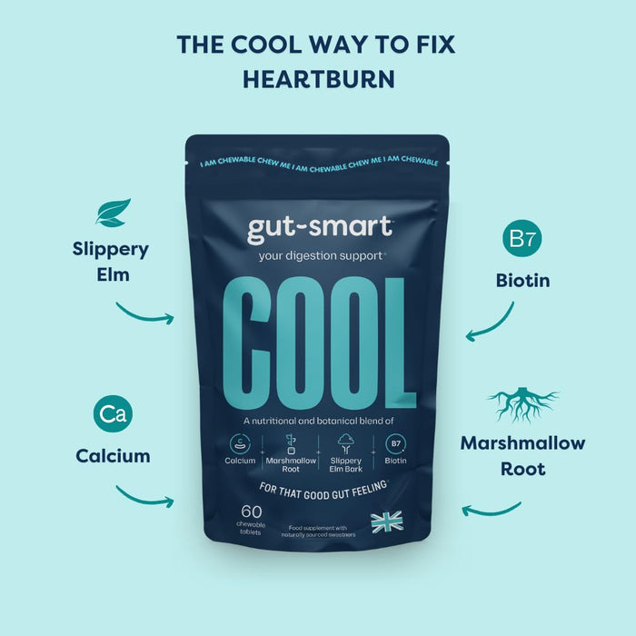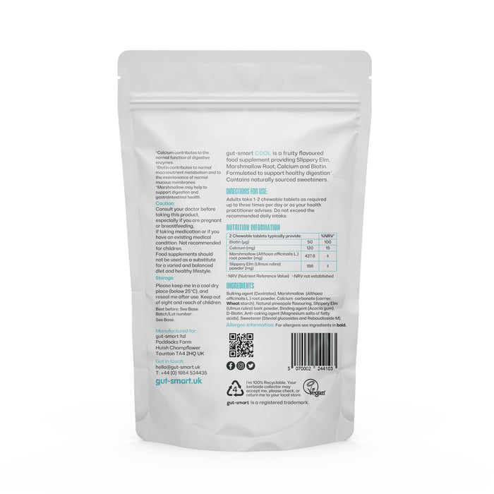 COOL is a food supplement containing Slippery Elm, Marshmallow Root, Calcium and Biotin, formulated to support healthy digestion and help fight heartburn, indigestion and other nasties that can make you feel uncomfortable. CALCIUM - contributes to the normal function of digestive enzymes. BIOTIN - contributes to normal macronutrient metabolism and to the maintenance of normal mucous membranes. SLIPPERY ELM and MARSHMALLOW ROOT - can increase mucus secretion and help sooth inflamed tissues to help support digestion and gastrointestinal health. 100% NATURAL and VEGAN - by combining herbal wisdom and modern healthcare this product is safe to take for as long as they are needed. DAILY CHEWABLE TABLETS - Adults take 1-2 chewable tablets as required up to three times per day or as your healthcare practitioner advises. REFILLABLE POCKET TIN - Handy pocket tin included with this item. A convenient way to ensure you can take your tablets with you, where ever you go. Helping everyone make the right choices in life for a happy, healthy gut, lose the distractions and enjoy your food again. Smart.