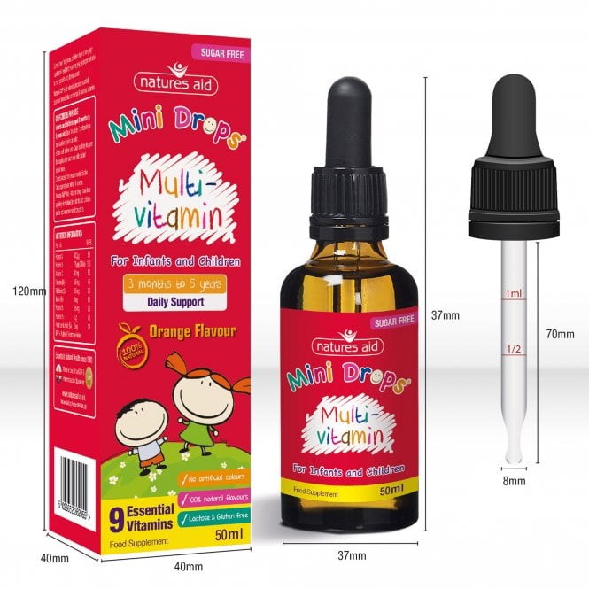 Nature's Aid Multi-vitamin Mini Drops is a carefully balanced formula that combines 9 essential vitamins with a natural orange flavour for a great taste and have no added sugar, colours or flavourings. During their first years, children have a very high nutritional need and vitamins play an important role in their growth and development. Nature's Aid Multi-vitamin Drops have been specifically designed for breastfed babies, infants and children aged 3 months to 5 years.