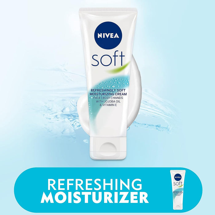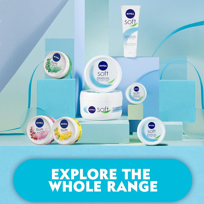 NIVEA Soft is a highly effective, revitalising moisturising cream for everyday use. The light formula with Vitamin E and Jojoba Oil is quickly absorbed and refreshes the skin. Enjoy the invigorating feeling that leaves your skin soft and supple all day long. This face, body and hand moisturiser is ideal for anyone who prefers a low-maintenance approach to skincare, or someone looking to save space amongst their beauty supplies. NIVEA Soft provides refreshing body and face care in one handy spot.