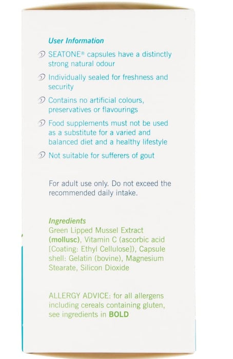 • Green Lipped Mussel Extract (mollusc), Vitamin C (ascorbic acid [Coating: Ethyl Cellulose]), Capsule Shell: Gelatin (bovine), Magnesium Stearate, Silicon DioxideProduct DescriptionSourced from sustainable New Zealand mussel farms. Only Seatone contains a purified extract (Biolane) from the Green Lipped Mussel, which is found in the clear unpolluted waters off New Zealand. Each capsule provides 350mg of green lipped mussel extract.> Biolane mussels are harvested only once they have reached peak condition. The naturally occurring compounds in Green Lipped Mussels are easily damaged by heat or other chemicals that are often used to create extracts.> Biolane has developed a process from harvesting to encapsulation that uses no chemicals, solvents or heat to retain the unique properties of this New Zealand shellfish.> The benefits of Seatone are thought to build over time, therefore a regular intake is recommended.